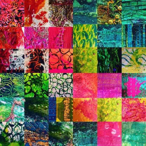 Colour and texture are celebrated again with variety of materials and techniques. Collages of fabrics have been hand-dyed, painted or printed, before being over-sewing with a riot of stitch and other embellishments such as beads, buttons and foils.