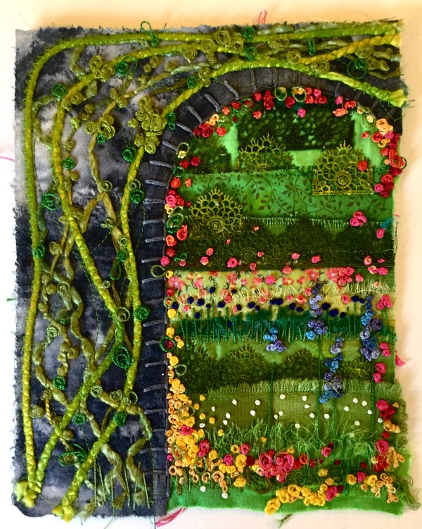 Other works are more abstract, compositions of fabrics and stitch, colours and textures with the imperfections of the media – frayed edges and hanging threads – adding to the richness of the whole.